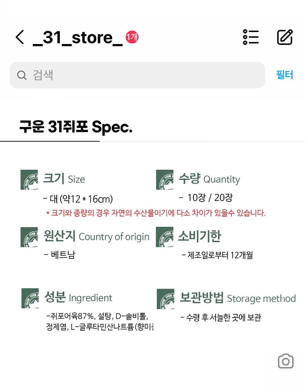 생산자 및 소재지 (수입품의 경우 생산자, 수입자 및 제조국) 생산자: 31건어물 (강원도 삼척시 미로면 동안로 98), 수입원: 진원 (원산지: 베트남)