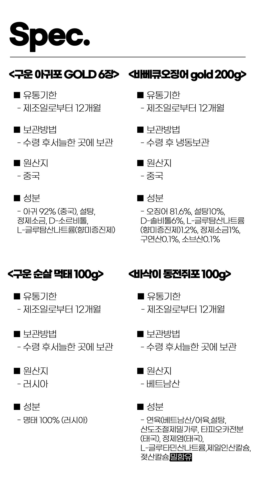 포장단위별 내용물의 용량(중량), 수량 구운쥐포 1봉 (10장), 구운오징어포 1봉 (3미), 구운 아귀포 GOLD 1봉 (6장), 구운 순살 먹태 1봉 (!00g)