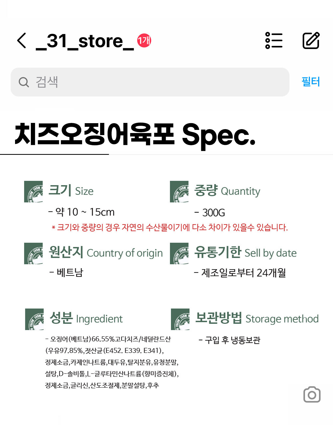 생산자 및 소재지 (수입품의 경우 생산자, 수입자 및 제조국) 소분원: 31건어물, 원산지: 베트남