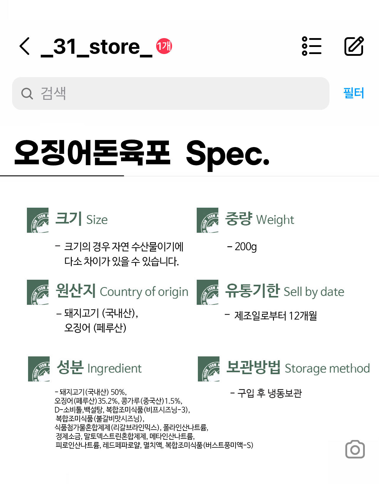생산자 및 소재지 (수입품의 경우 생산자, 수입자 및 제조국) 소분원: 31건어물, 원산지: 국내산