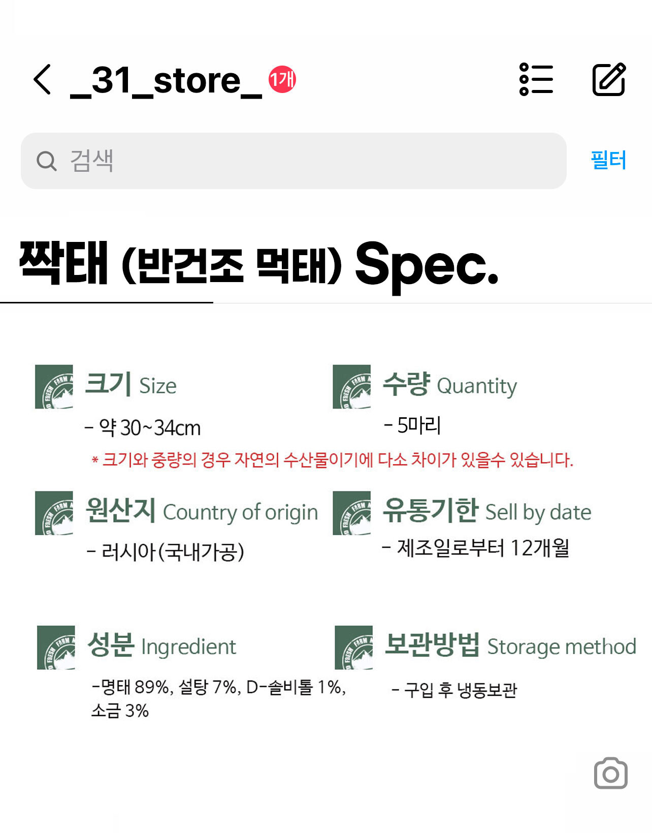 원재료명 (농수산물의 원산지 표시 등에 관한 법률에 따른 원산지 표시 포함) 및 함량 명태89%(러시아산),설탕7%,식염3%,D-솔비톨1%