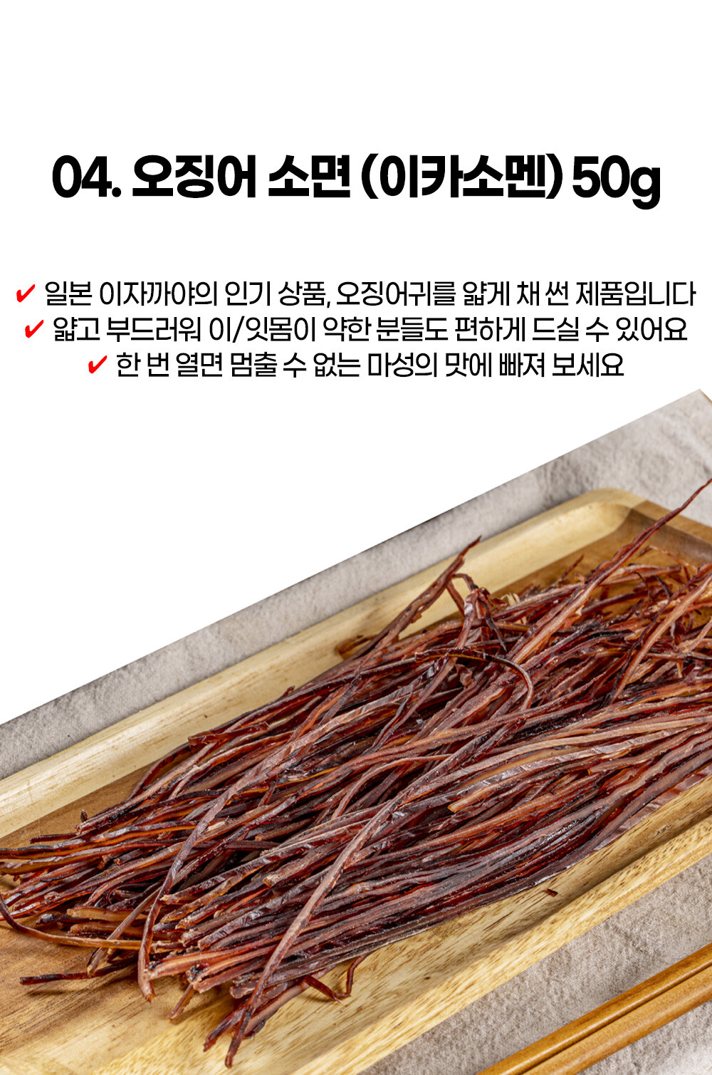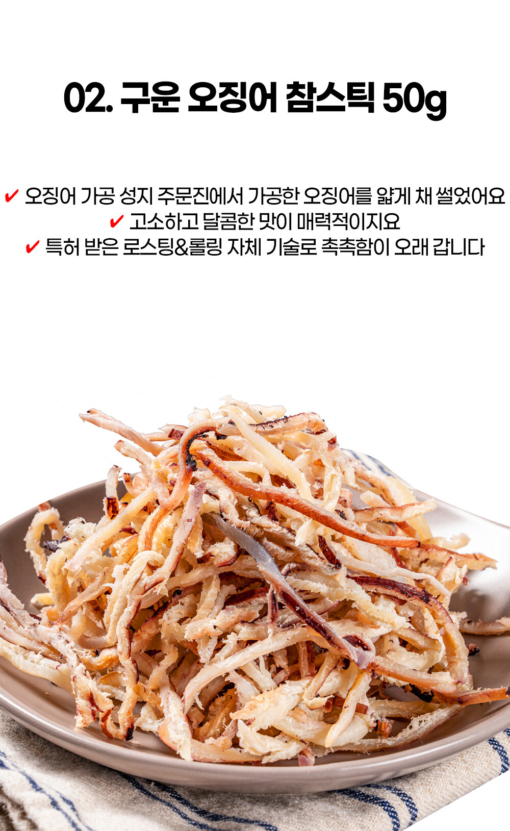 원재료명 (농수산물의 원산지 표시 등에 관한 법률에 따른 원산지 표시 포함) 및 함량 바베큐오징어: 오징어81.6%,설탕10%,D-소비톨6%,L-글루탐산나트륨(향미증진제)1.2%,정제소금1%,구연산0.1%,소브산(보존료)0.1%, 이카소멘: 오징어90.47%(베트남산),설탕5.25%,D-소비톨2.1%,정제염1.5%,L-글루탐산나트륨(향미증진제)0.50%,글리신0.05%,DL-알라닌0.04%,효소처리스테비아0.03%,호박산나트륨0.03%,소브산칼륨(보존료)0.03%, 구운참스틱: 오징어90.02%(페루산),백설탕(감미료)7.07%,정제소금(국내산)1%,D-소비톨1.2%,:L-글루탐산나트륨(향미증진제)0.4%,구연산0.15%,효소처리스테비아0.01%,호박산이나트륨0.03%,글리신0.08%,5'-리보뉴클레오티드이나트륨0.04%, 구운쥐포채: 쥐치87%(베트남산),설탕,D-소비톨,L-글루탐산나트륨(향미증진제),정제소금
