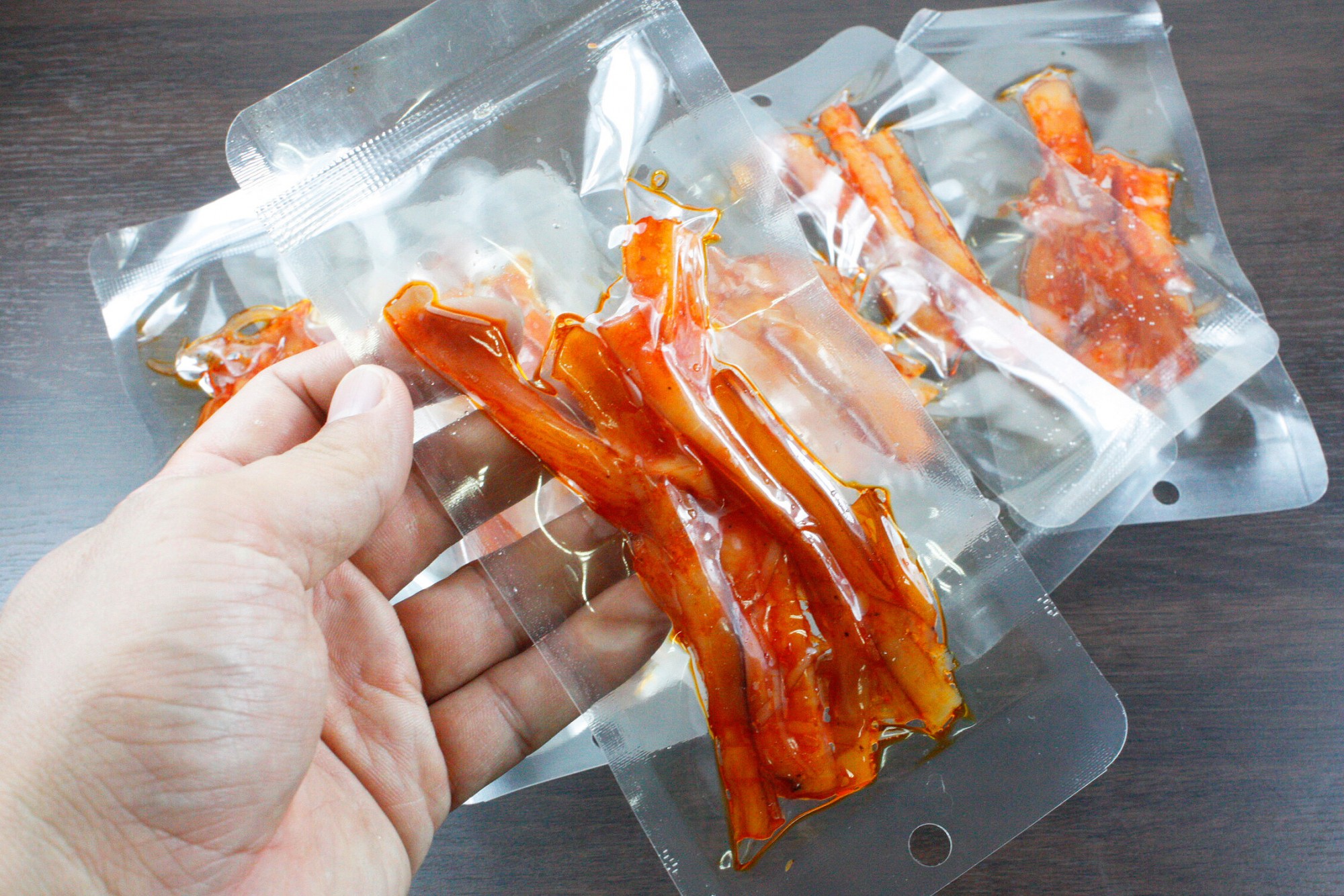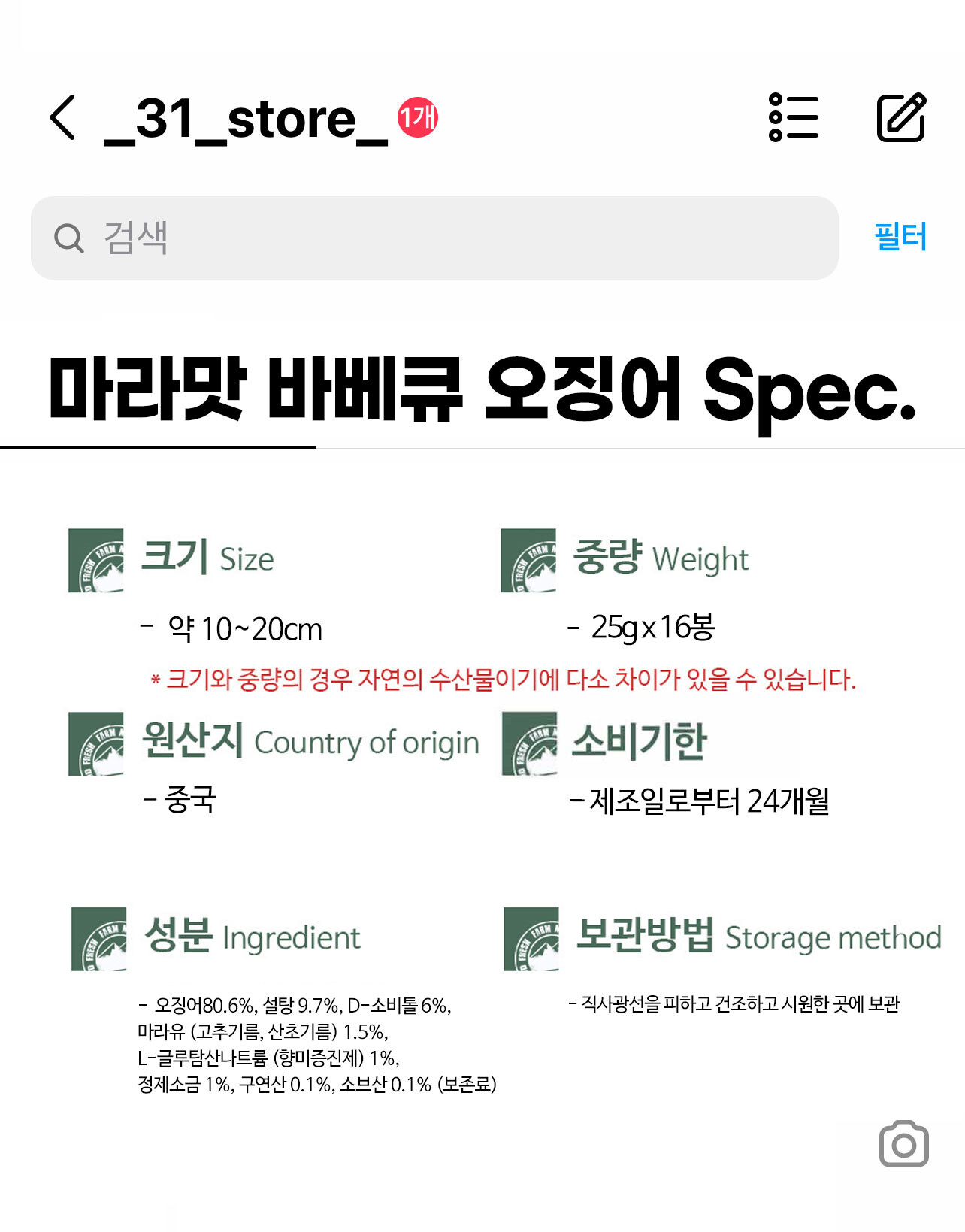 원재료명 (농수산물의 원산지 표시 등에 관한 법률에 따른 원산지 표시 포함) 및 함량 오징어 80.6%, 설탕 9.7%, D-소비톨 6%, 마라유 (고추기름, 산초기름) 1.5%, L-글루탐산나트륨 1%, 정제소금 1%, 구연산 0.1%, 소브산 0.1% (보존료)