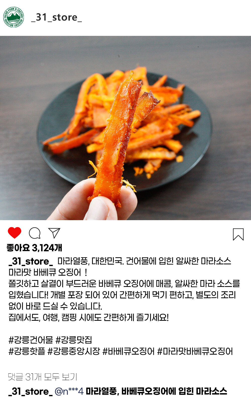 • 화끈 불향 마라맛이 일품인 촉촉 바베큐 오징어입니다, 개별포장으로 더욱 편하게 즐기세요.
