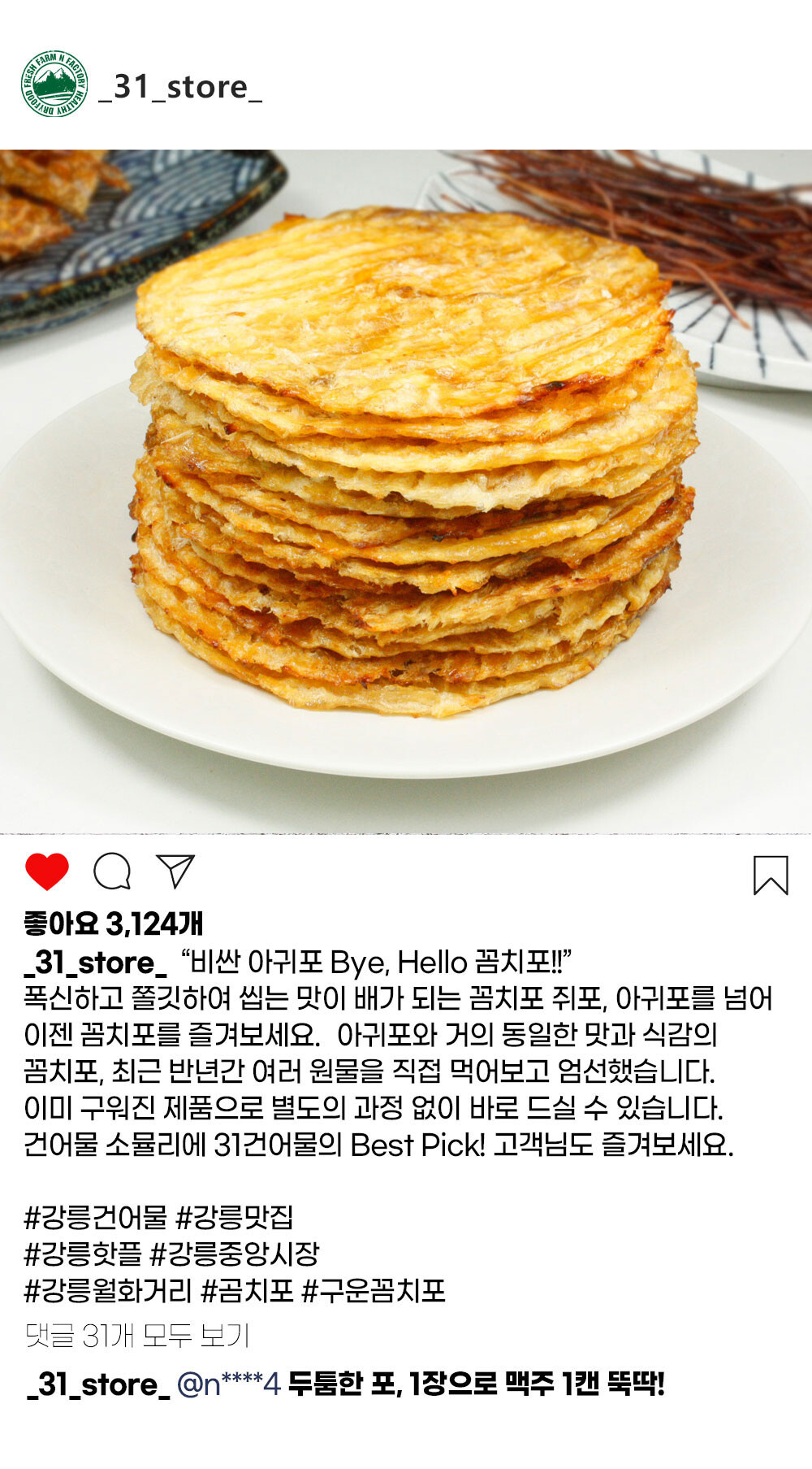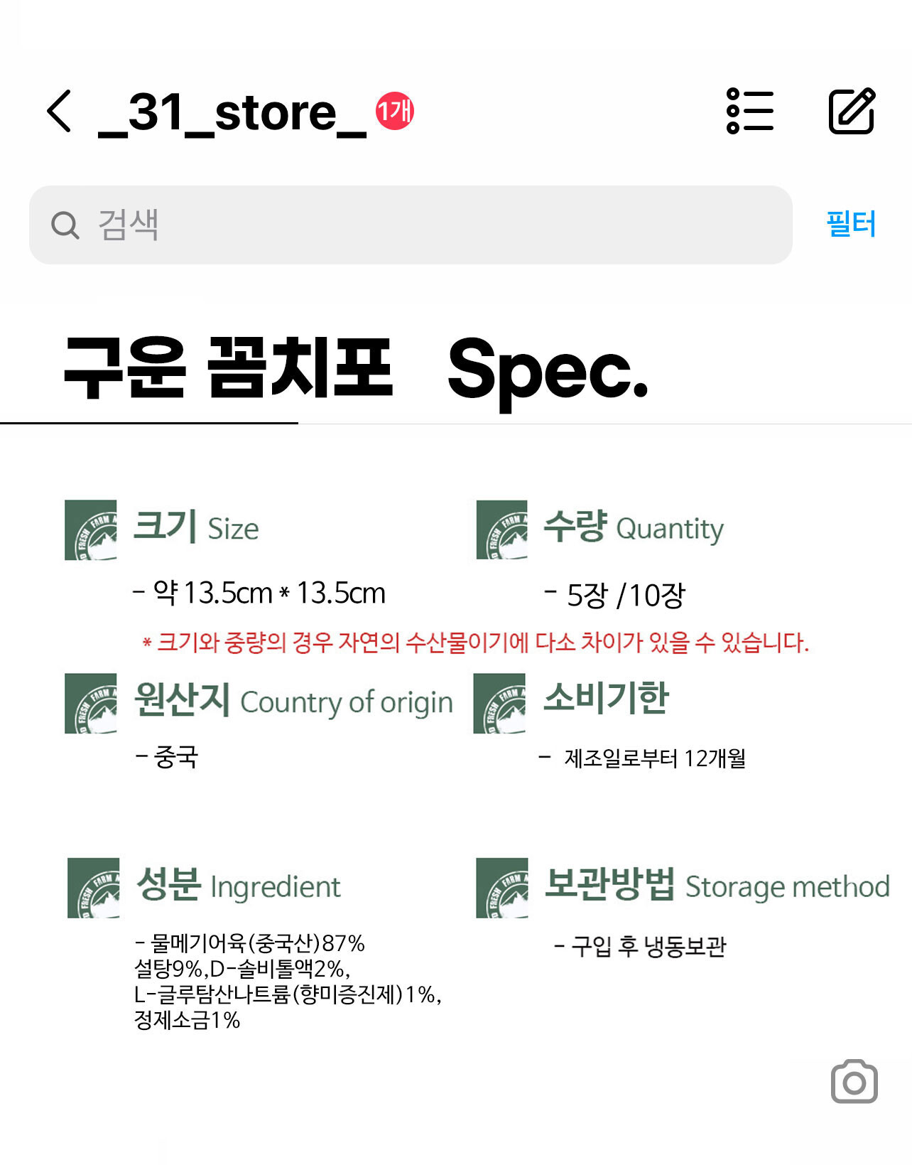생산자 및 소재지 (수입품의 경우 생산자, 수입자 및 제조국) 생산자: 31건어물 (강원도 삼척시 미로면 동안로 98), 원산지: 중국