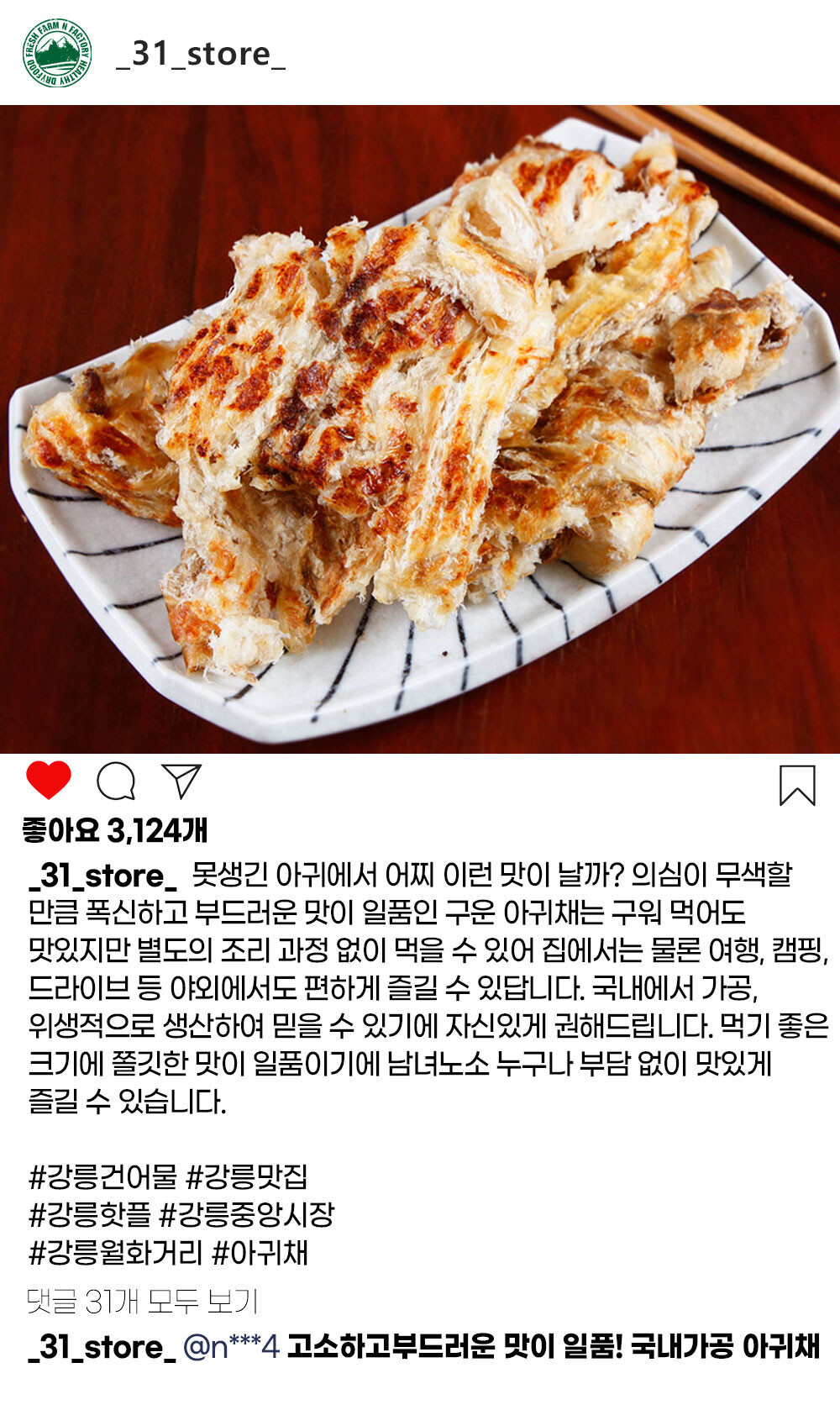 • 자체 특허 기술인 Roasting & Rolling 기술로 제조했습니다. 아귀채의 특별한 맛을 즐겨보세요.