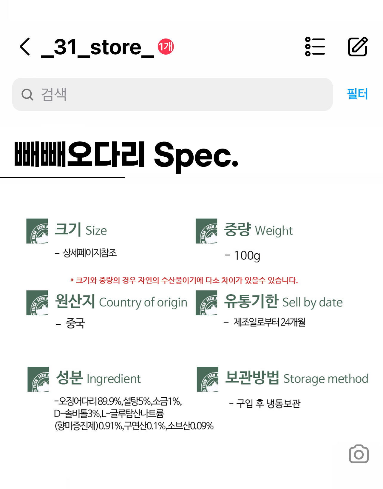 원재료명 (농수산물의 원산지 표시 등에 관한 법률에 따른 원산지 표시 포함) 및 함량 오징어다리89.8%(중국산),설탕5%,소금1%,D-소비톨3%,L-글루탐산나트륨(향미증진제)0.91%,구연산0.1%,소브산0.09%
