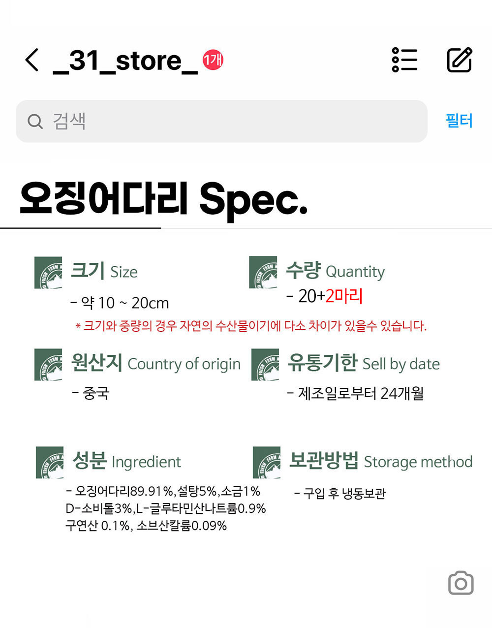 생산자 및 소재지 (수입품의 경우 생산자, 수입자 및 제조국) 소분원: 31건어물 (강원도 삼척시 미로면 동안로 98), 원산지: 중국